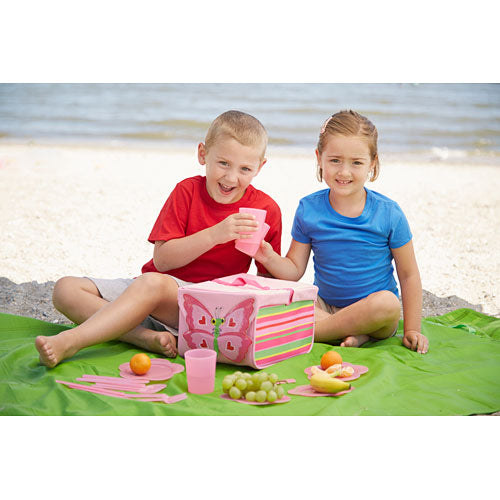 Beautiful and functional, this complete picnic set stores in a butterfly adorned, sturdy fabric, picnic basket. Comes with place settings for four: cups, forks, spoons, knives, and flower-shaped plates. Dishwasher safe.