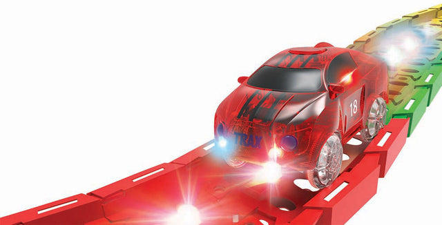Turn the lights down. This powerful, transparent race car explodes with color as it races over the tracks – lit by vibrant LED lights! Flexible snap-together pieces let kids design different courses. Powered by 4 AAA batteries (not included) or micro USB connection.