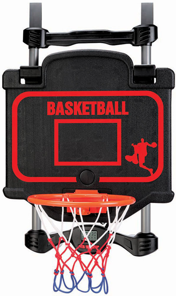 Turn a door into a gym. This great design easily flips from punching bag to hoop, adjusting for multiple heights. A ball and air pump are included, along with a timer, shot clock and sound effects to crank up the excitement. Requires 3 AAA batteries.
