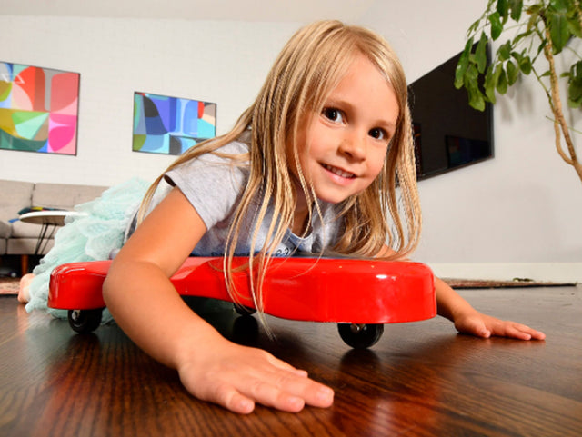 This unique triangle scooter on wheels lets kids glide, swivel, and zoom while sitting, kneeling, or belly surfing! Develops balance, core strength, and coordination. Non-slip silicone pad means no sliding off, so let's go!
