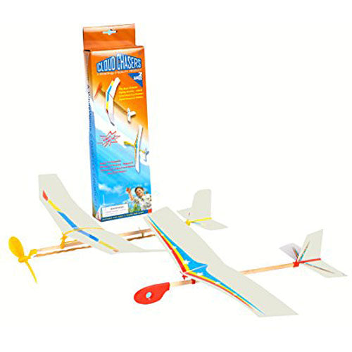 Cloud Chasers include the best of both flying worlds with 1 hand launched and 1 rubber band powered glider. These durable balsa and foam gliders fly over 100 feet and are quick to assemble with no glue or scissors required. Suitable for ages 8 and up. Made in China.