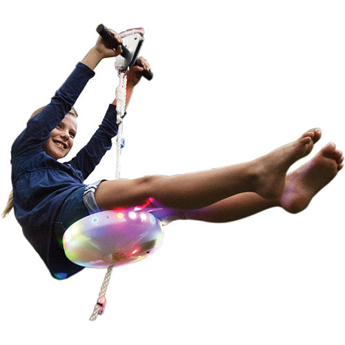 You’ll have a hard time getting the kids out of the backyard with this durable and fun 100' steel zipline trolley with cool multicolored lights in the seat, the rope and the trolley. The ride is smooth, the stop is gradual and the fun is endless! Holds up to 250 lbs, with easy instructions. Removable rope and seat add another adventure dimension. 3 AA batteries included. Adult supervision and installation advised. From Brand 44 Colorado for ages 8 yrs-adult.