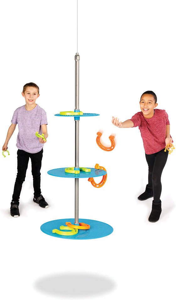Toss 8 rubbery, flexible horseshoes onto 3 moving platforms on a swinging, swaying pole! Easily suspends from any door frame—indoors or out—to test coordination and concentration. For 2-4 players.