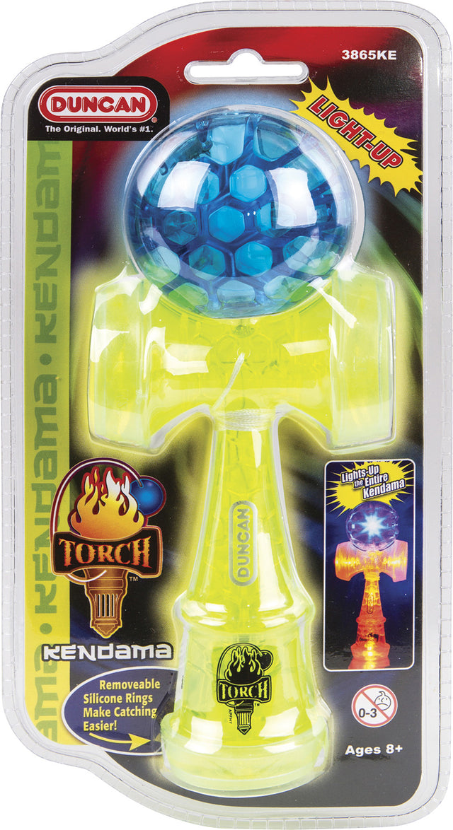 Play day or night with the Torch Kendama as the base and ball illuminate for exciting play. Remove the cups' silicone rings to test your growing skills. Batteries included.