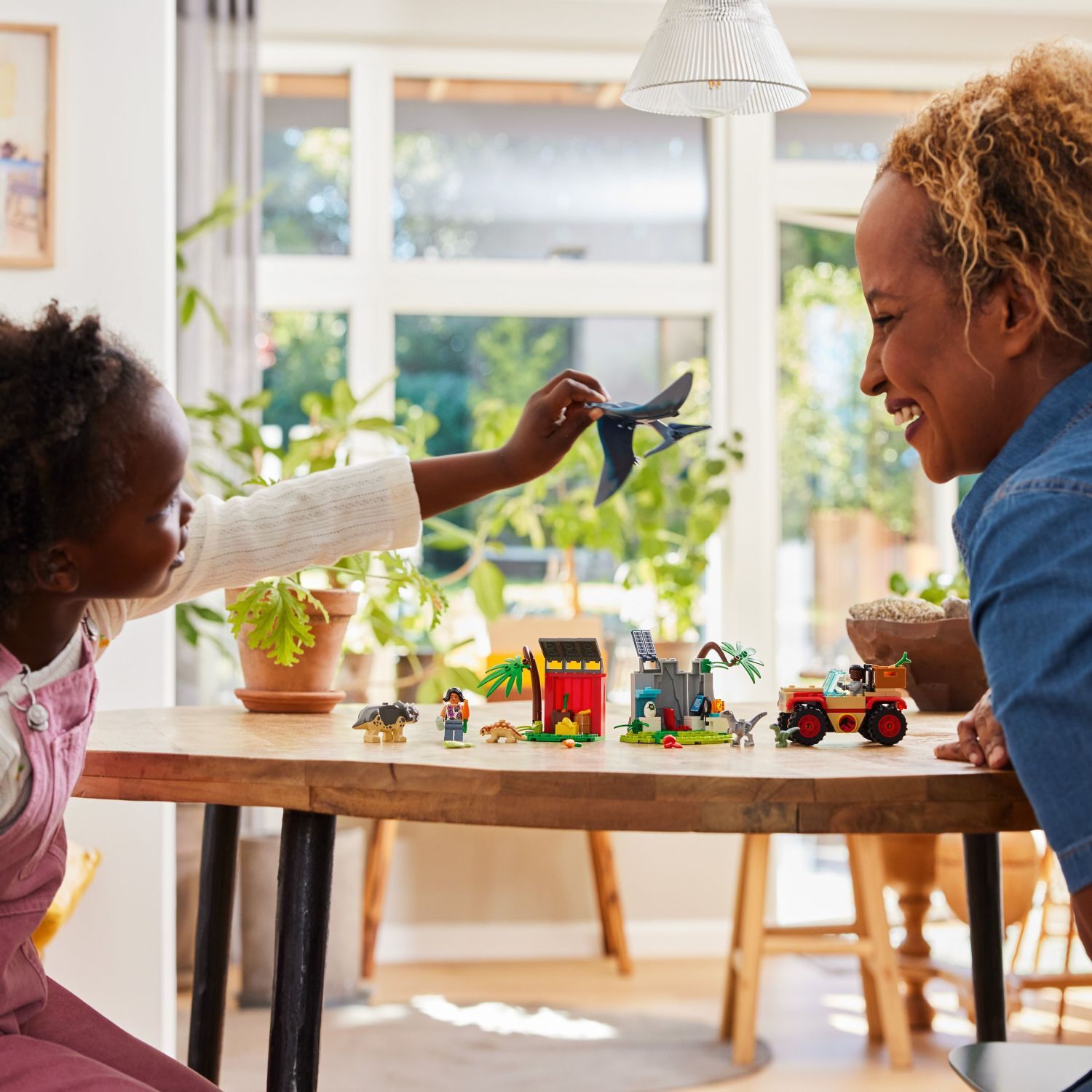 Young fans aged 4+ can care for and play with dinosaur babies while learning to build with this LEGO Jurassic World Baby Dinosaur Rescue Center (76963) set. It includes an off-road vehicle and research area with a cave wall, both with Starter Brick elements, plus a feeding station. 2 minifigures, baby Ankylosaurus, Triceratops and Velociraptor figures, and small Velociraptor and adult Pteranodon kids' dinosaur toy figures get play started fast.