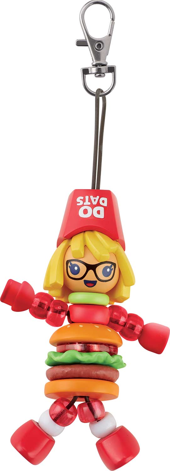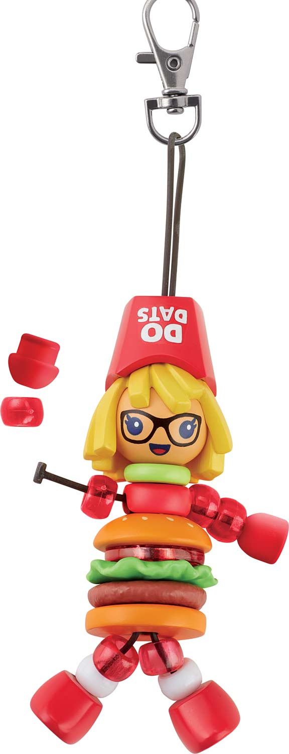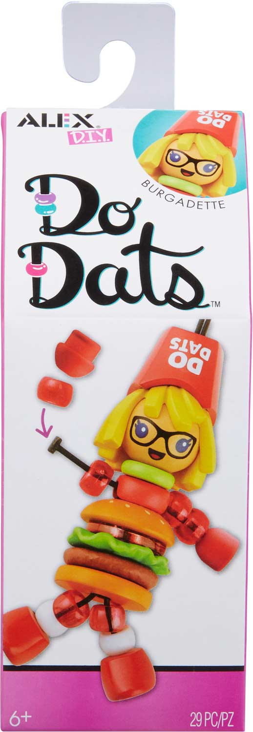 ALEX DIY Do Dats Burgadette will have your friends asking, how did you DO Dat? Make an adorable and unique dangling character to hang with! Burgadette is a fast food fanatic with a burger body and French fry hair. She loves to super-size her meal and her motto is “I'm all that and a side of fries”! Mix and match her beaded parts with other Do Dats characters. She hangs from anywhere with a lobster clasp and has special beads that allow her to hold hands with her friends. She also comes with a mystery bead as a creative surprise. Includes 25 beads and accessories, 2-piece body frame, lobster clasp and instructions. Recommended for children 6 years of age and older.