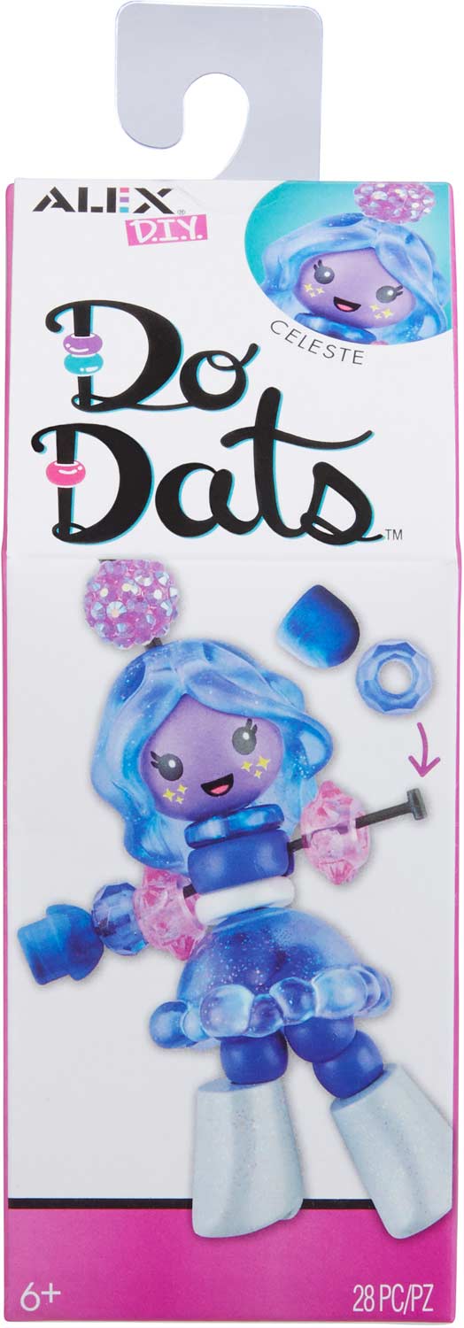 ALEX DIY Do Dats Celeste will have your friends asking, how did you DO Dat? Make an adorable and unique dangling character to hang with! Celeste is a star child with purple skin and blue hair. She loves stargazing and her motto is “Anything is possible in this big universe”! Mix and match her beaded parts with other Do Dats characters. She hangs from anywhere with a lobster clasp and has special beads that allow her to hold hands with her friends. She also comes with a mystery bead as a creative surprise. Includes 25 beads and accessories, 2-piece body frame, lobster clasp and instructions. Recommended for children 6 years of age and older.