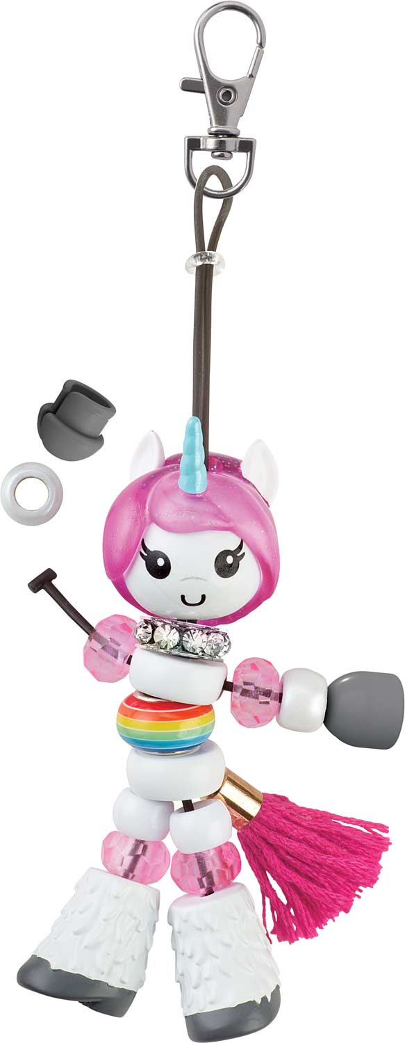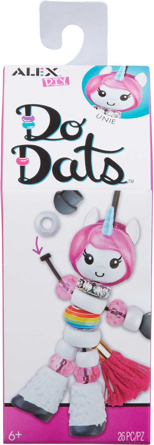 ALEX DIY Do Dats Unie will have your friends asking, how did you DO Dat? Make an adorable and unique dangling character to hang with! Unie is a heroic protector with a pink hair and a blue horn. She loves standing up for others and her motto is “U B U - Unique and magnifique”! Mix and match her beaded parts with other Do Dats characters. She hangs from anywhere with a lobster clasp and has special beads that allow her to hold hands with her friends. She also comes with a mystery bead as a creative surprise. Includes 23 beads and accessories, 2-piece body frame, lobster clasp and instructions. Recommended for children 6 years of age and older.