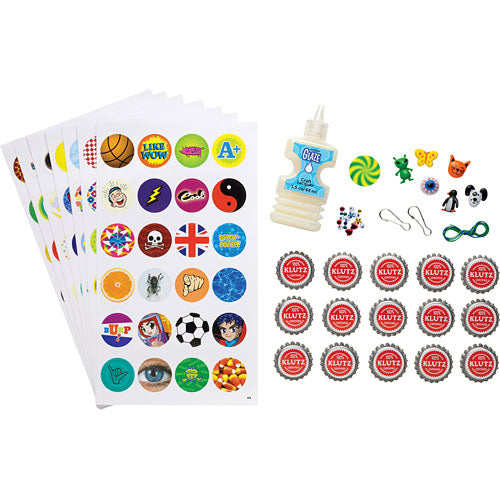 We've given our own Klutz pop art original a makeover. Capsters includes 15 kid-safe bottle caps, a bunch of super cute charms, googly eyes, jewels, and other supplies plus over 160 pieces of punch-out art. Just take a bottle cap, add any embellishments you want, then top it off with our shiny glaze. Voila, an original piece of art as cool as it is collectable.