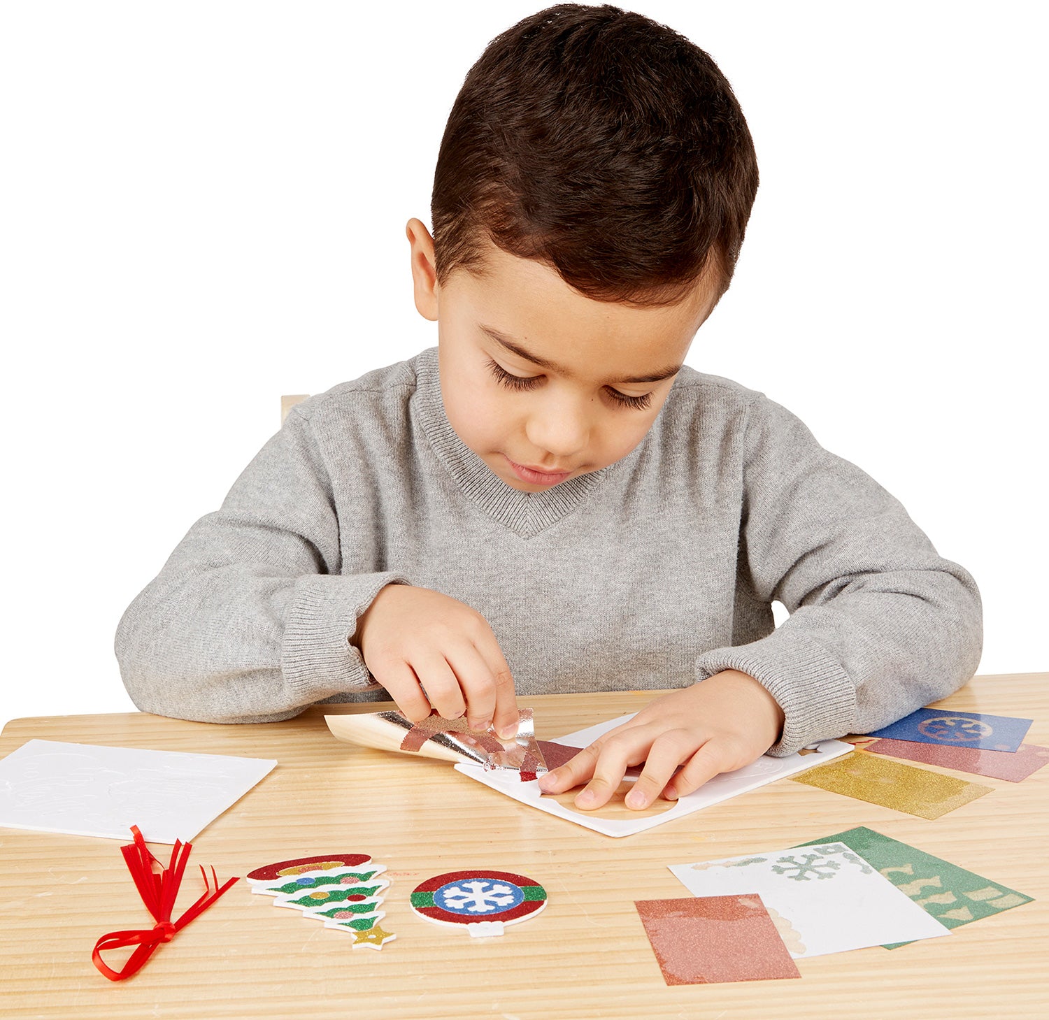 Make dazzling Christmas decorations with press-on glitter! Our patented technology lets kids get the look and feel of real glitter without the mess. One simple process creates amazing results: Just peel away a section of white paper from the six foam Christmas-themed ornaments to reveal the sticky surface, then select which of the seven different-colored glitter sheets to press on for instant sparkling art. Attach the included satin ribbons to hang glittering ornaments on the tree or anywhere!
