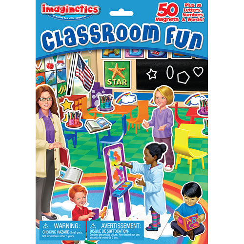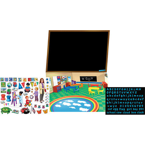 Contains one play-board and two magnet sheets, which includes 50 magnets and 99 magnetic letters and words. Children can have fun pretending they are in the classroom, or they can practice their alphabet on the convenient blackboard. Open play-board measures 18" x 12.75".