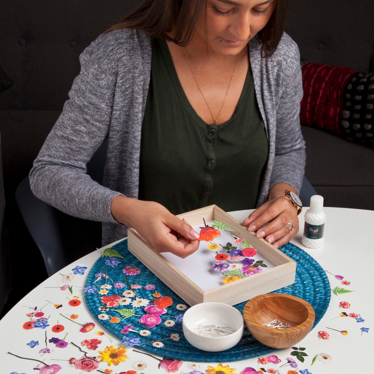 • Includes 233 paper flowers, 1 7"x9" (17.7x22.8 cm) wood frame, 80 metal pins, 1 pc foam, 1 fl. oz (29 mL) water-based glue, instructions
