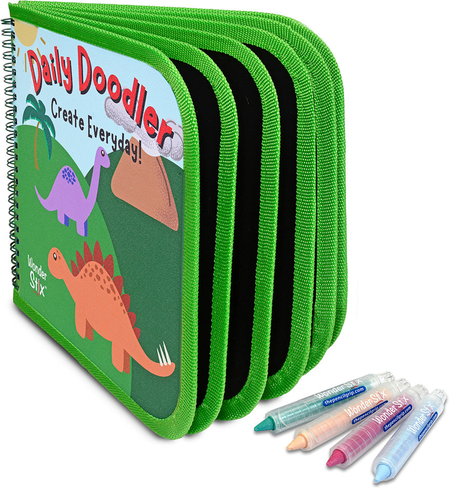 Encourage creativity every day with an activity book that has 8 wipeable blank pages! The cover features two happy dinosaurs to spark imaginations. It comes with 4 Wonder Stix and a travel pouch, making it a perfect eco-friendly activity for car trips or plane rides. The pages wipe clean with a damp cloth so it can be reused again and again! Try using it for practicing writing skills, giving prompts for doodling, or even learning math!