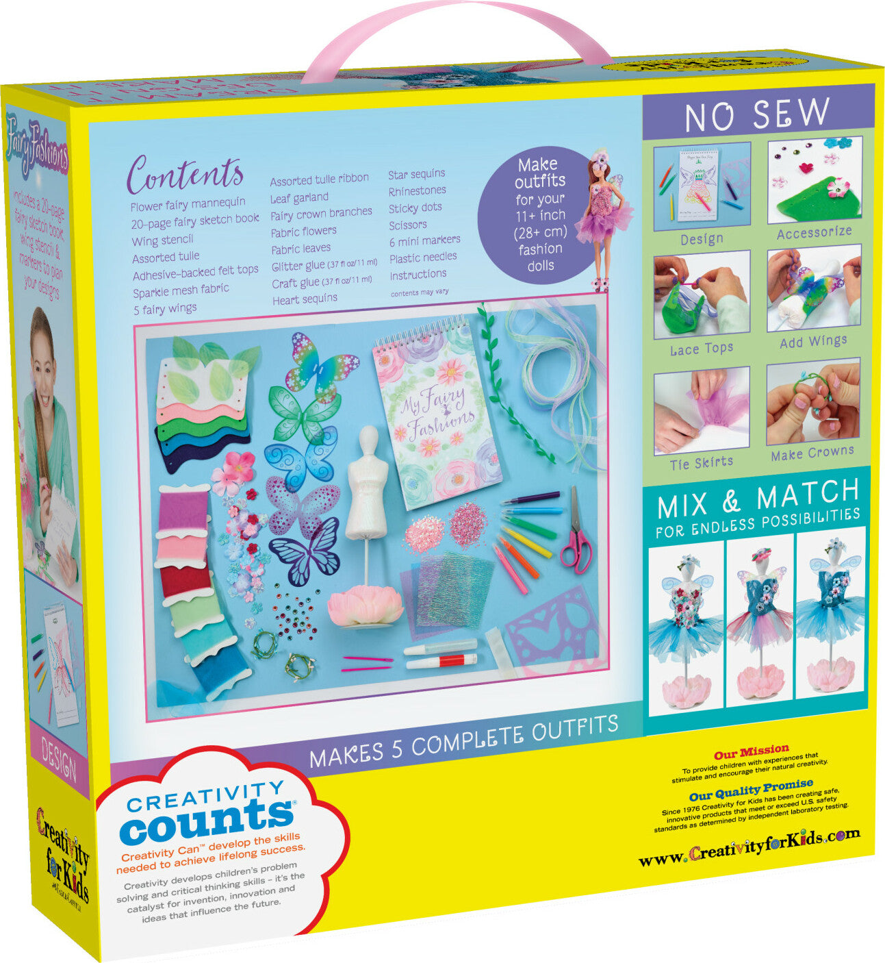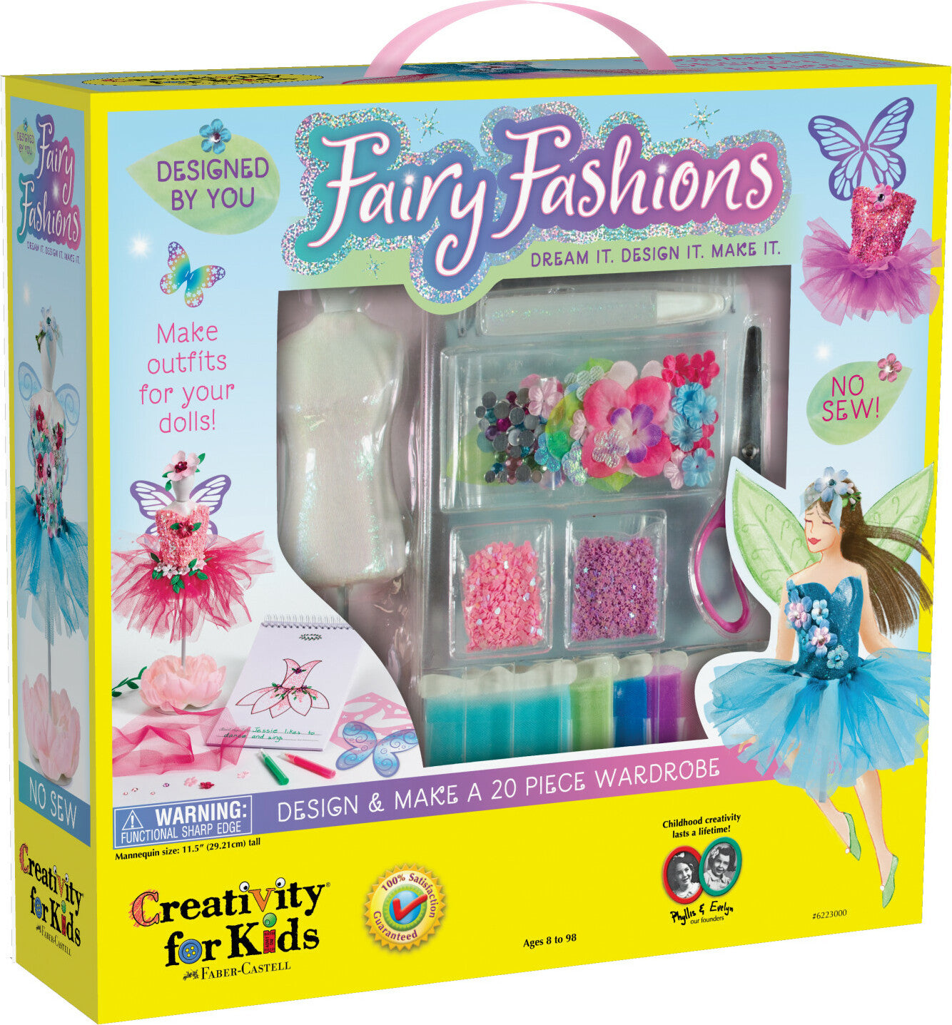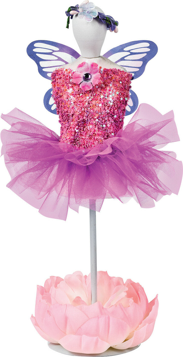 Create your no-sew fashions using the mannequin, 16 ½ yards of tulle, flowers, ribbon, rhinestones, fairy wings, butterflies, lace-up tops and more. Add glitter glue and rhinestones for extra sparkle.