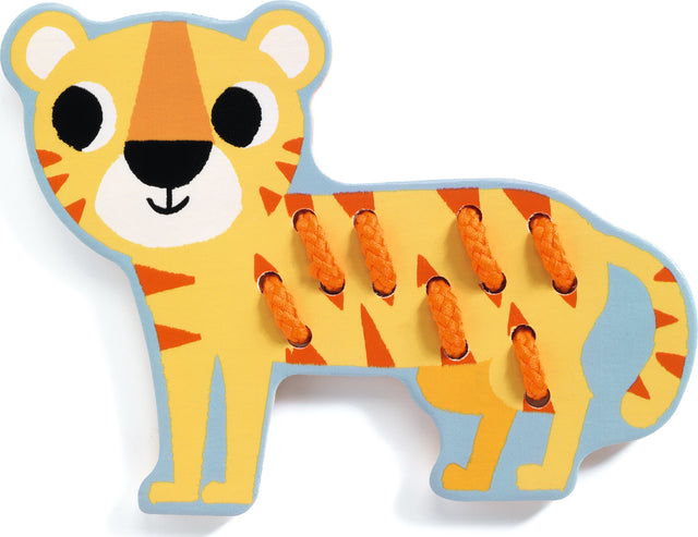 Lassanimo is a lacing game for little ones aged 2 and over. Children use coloured laces to decorate animals that live on the savannah with their markings. The zebra and the tiger get given their stripes, the lion its mane, and the crocodile its scales.
