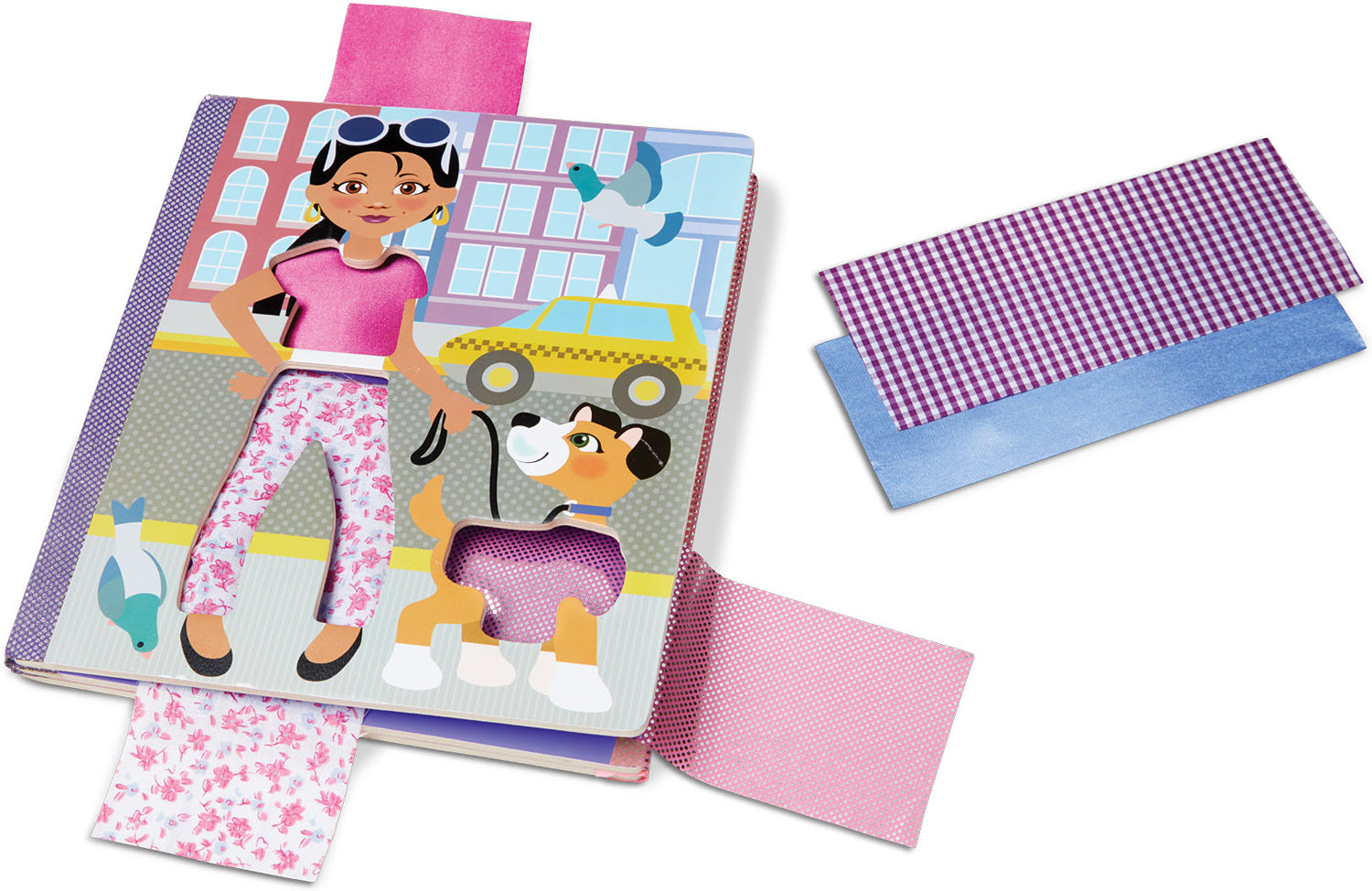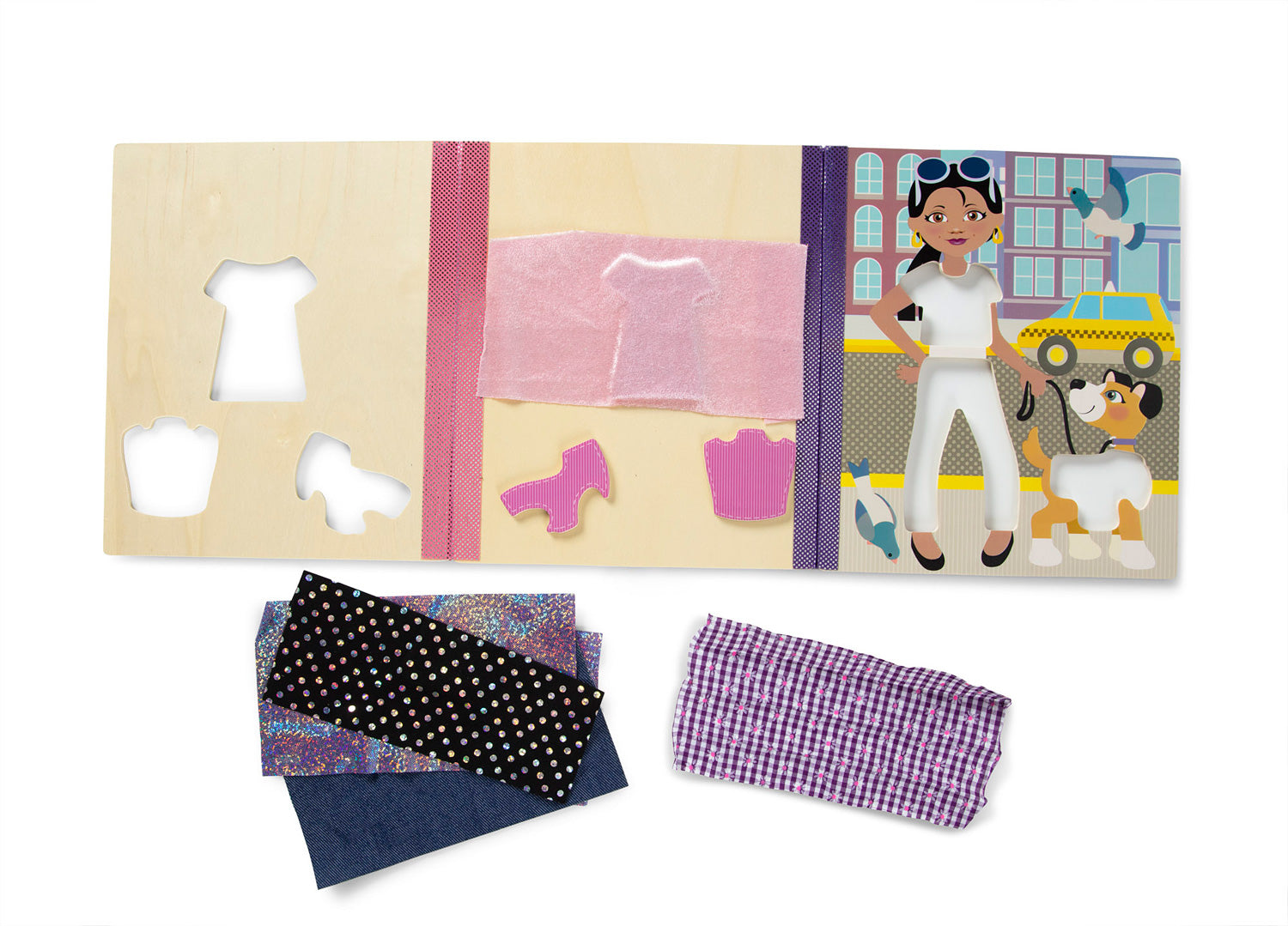Young designers will love creating their own unique looks and designs with this double-sided wooden fabric press! Open the press like a book, layer fabric swatches, then close the press to "dress" the figures, their bags, and their pets! With 24 fabric pieces, there are countless options for designing fun and fashionable multi-textured outfits. It's a great way for kids five and older to explore their creativity and develop fine motor and storytelling skills. The fabric pieces and press store in a convenient take-along bag, making this a perfect travel activity, too!
