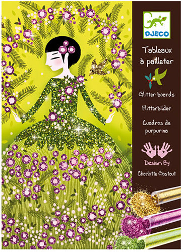 Go from pretty to dazzling! Glitter Dresses gives you 4 beautiful women to glitter-fy with 6 tubes of glitter. Each 5.9" x 8.3" illustration has a sticky surface. Use the gadget to strategically remove the paper. Add glitter, and then use the brush to sweep off the excess. Includes storage boxes and illustrated design booklet. For ages 8-12 yrs.