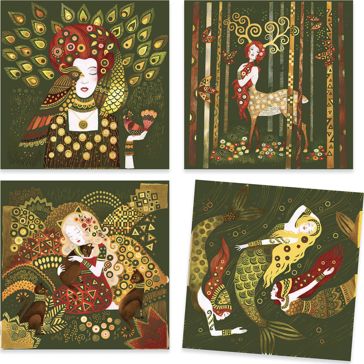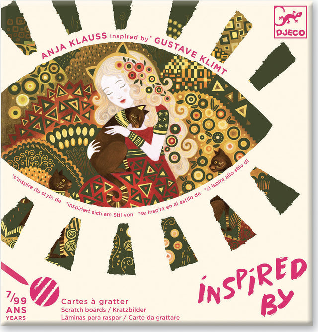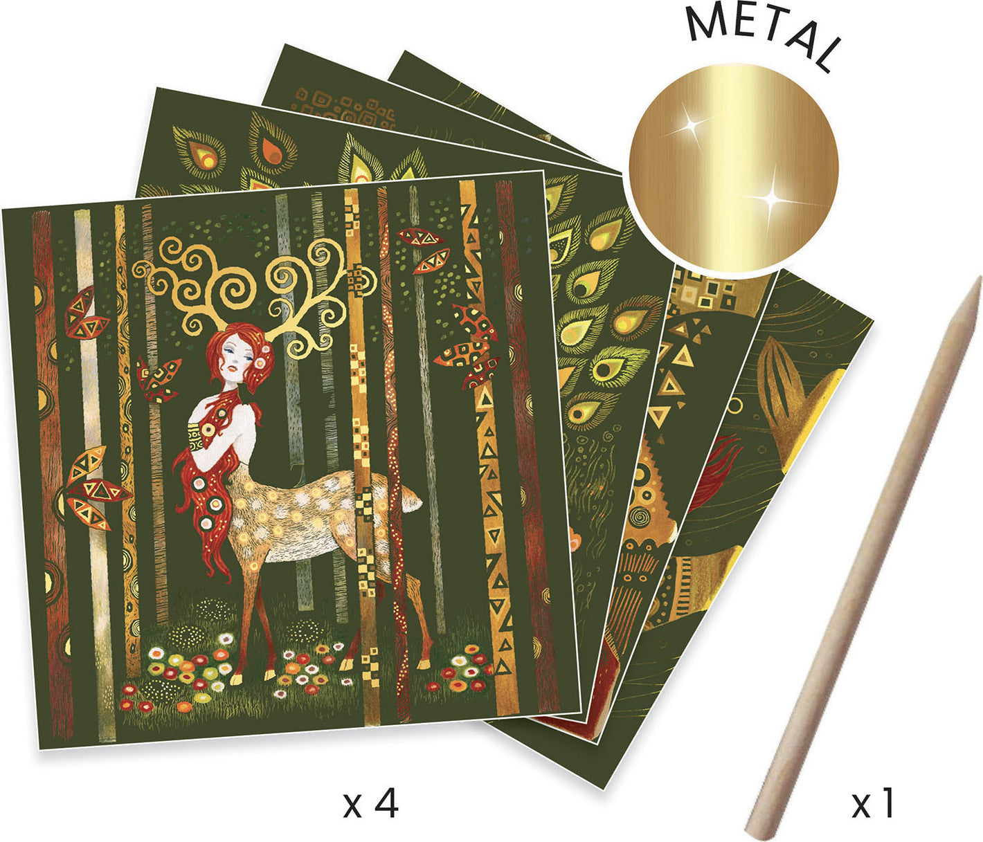 A pack of scratch cards that invites children to discover the style of Gustav Klimt, the great master of Art Nouveau. Using the wooden stylus, children scratch the surface of the cards, revealing the motifs imagined by the illustrator. Thus, the compositions are gradually revealed and the gold-flecked young girls come to life!