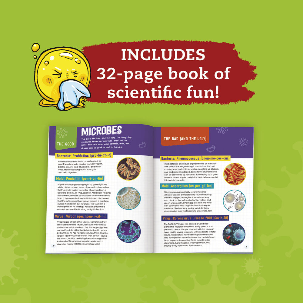 Squeeze slimy snots through a soft and squishy nose! Explore ten different experiments on sinus-based anatomy, make sense of scents with the power of smell, and even whip up a batch of boogers! Learn how snot, mucus, and nose hairs protect your body. Use the fake sneezer to find the best ways to stop a sneeze or cough, and grow germs in a safe petri dish culture. Finally, try out soapy science activities to observe how germs can be eradicated.