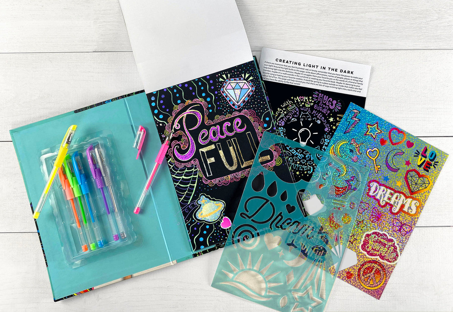 No worries, everything you need is right here! Fold-up binder with elastic closure includes 8 neon gel pens, stencil, sheet of foil stickers, black drawing paper, 5 guided activity pages and a comprehensive art guide. Make beautiful uplifting phrases, meditative doodles, your own constellations and more. These expressive activities were developed in collaboration with Art Feeds. Their unique approach blends therapeutic art with art education.