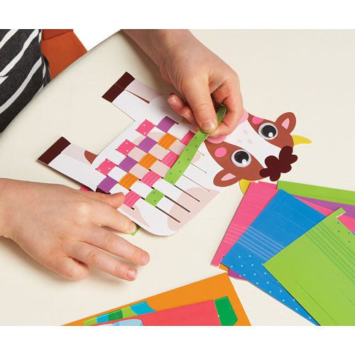 Create these cute animal characters by weaving paper strips through the animal body and attaching googly eyes. When finished, insert animal character into paper stand for playtime fun or as a decoration! Each kit includes: 4 paper board animal characters with stands, 20 colorful paper weaving strips, googly eyes and double-sided sticky circles.