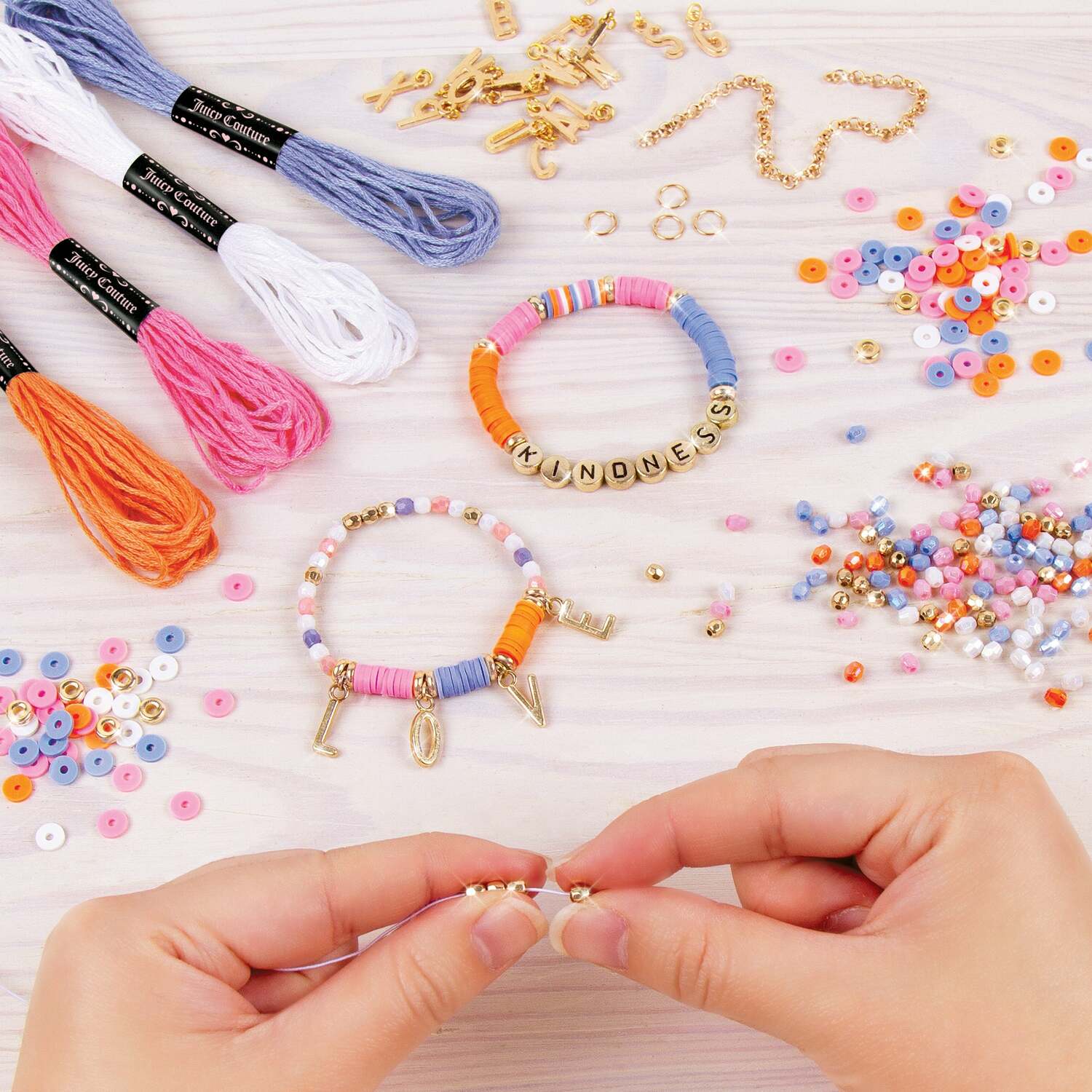Customize bracelets for your crew! This kit has everything you need to craft your very own Juicy Couture jewelry. Create seriously stunning pieces using a mixture of heishi beads, letter beads and charms, thread and elastic cord. They'll be so pretty; everyone will think they came from a high-end boutique! Ages 8+