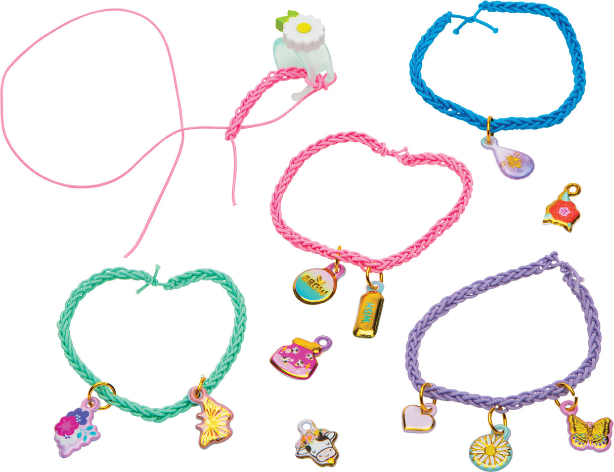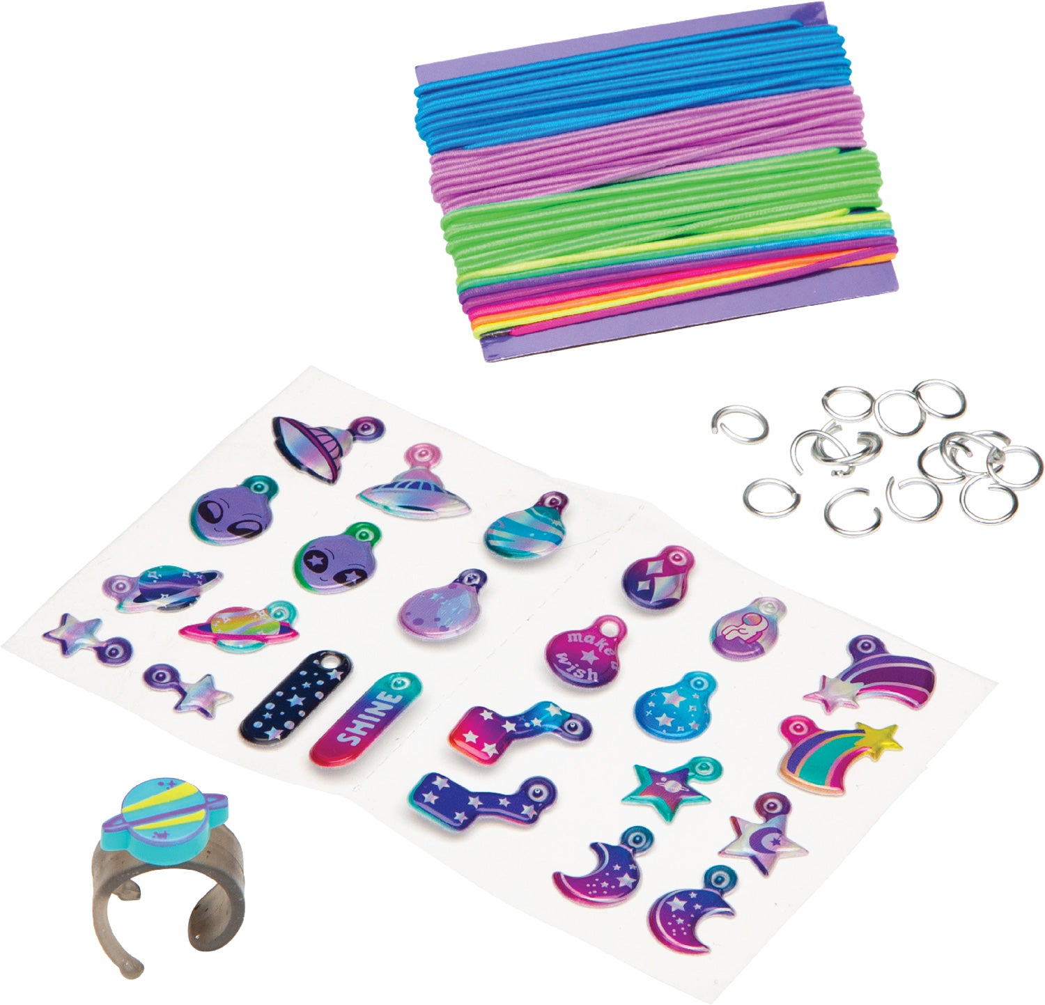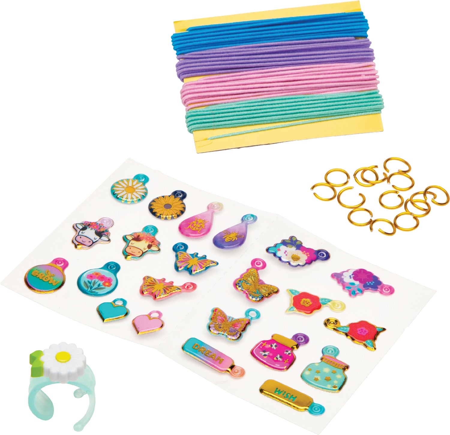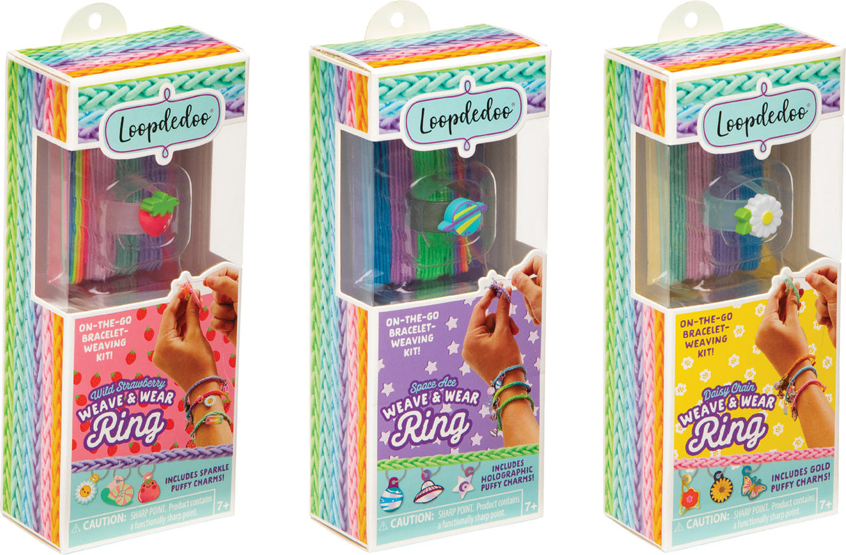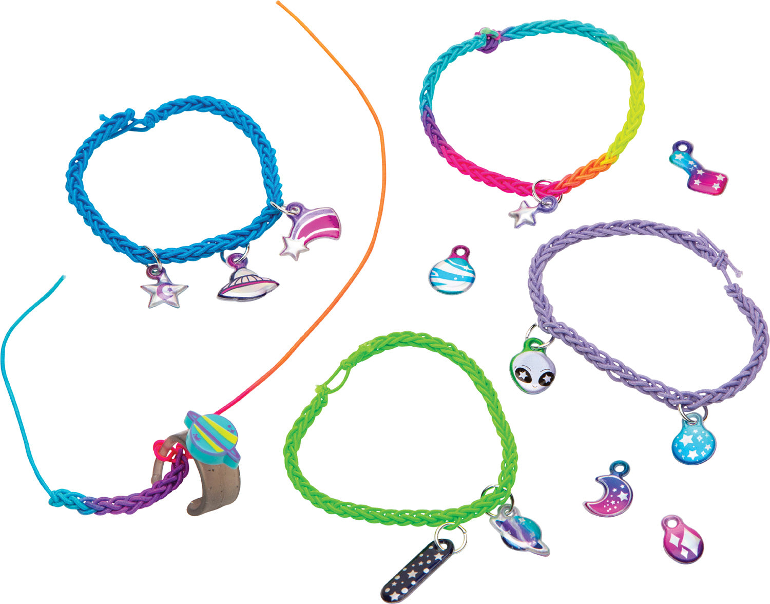 Tweens and teens can make DIY bracelets on the go with these kits. It's a wearable ring that crafters can use to easily weave brightly colored bracelets. Each kit includes 1.5 yards of elastic, 12 adorable puffy charms, and instructions. Wear it, weave it, then wear it some more! Available in three styles: daisy chain, wild strawberry, and space ace. Styles and selection may vary. Each sold separately.