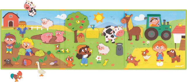 Come and spend a busy day on the farm! Whilst the farmer has gone to tend to his crops, little ones are tasked to pick apples and prevent the crafty sheep from trying to escape! With the 30 magnets and large magnetic backdrop, little ones will have everything they need to invent great farm adventures! This small book is handy for taking everywhere! Magnetic toy made from FSCTM cardboard. Toy for children aged 3 and up.