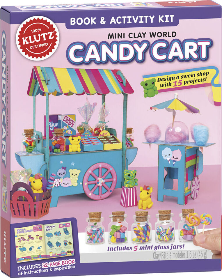The perfect miniature scene for crafters with a sweet tooth! Dazzling candy-colored clay and puffs of pastel cotton let you re-create all sorts of confectionery, from sour gummies to rainbow ribbon candy, tie-dye jawbreakers, swizzle sticks, clouds of cotton candy, and more! Creative prompts encourage crafters to invent their own candy brands, and display them in clear glass-looking jars with stoppers, in miniature boxes, on wooden lollipop sticks, or in iridescent cellophane baggies with twist ties. Slot together the cotton candy stand with a clear dome to serve your customers, and a tented kiosk to display your assortment of sweet treats. (Don't forget the...
