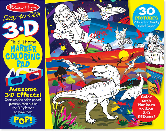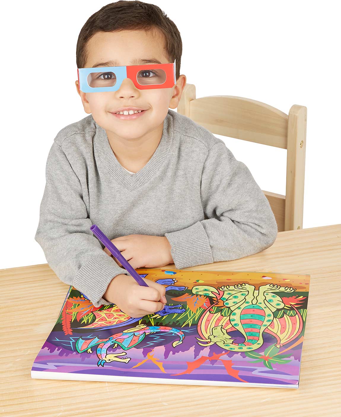 Create colorful adventure scenes that pop! There are 30 pages of color-coded illustrations to fill in with markers. Use the included 3D glasses to transform the colored pages into multi-dimensional looking scenes warm colors like red and orange come forward, while cool colors like blue and green recede into the background! A terrific activity for artists ages 4 and older, the unique coloring and viewing experience promotes fine motor skills, color recognition, and creative play.