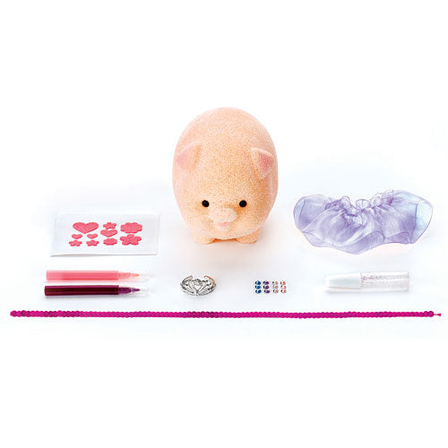 This glitter piggy comes with her own tiara, jewels, peel and stick accessories, a tulle tutu and 2 mini markers. Piggy measures 6" L x 3" w and includes a plastic stopper for easy access to your savings