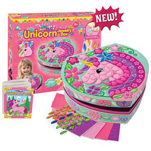 Add sparkling tiles and jewels to this beautiful jewelry box. The Unicorn will watch over your treasures and keep them safe!