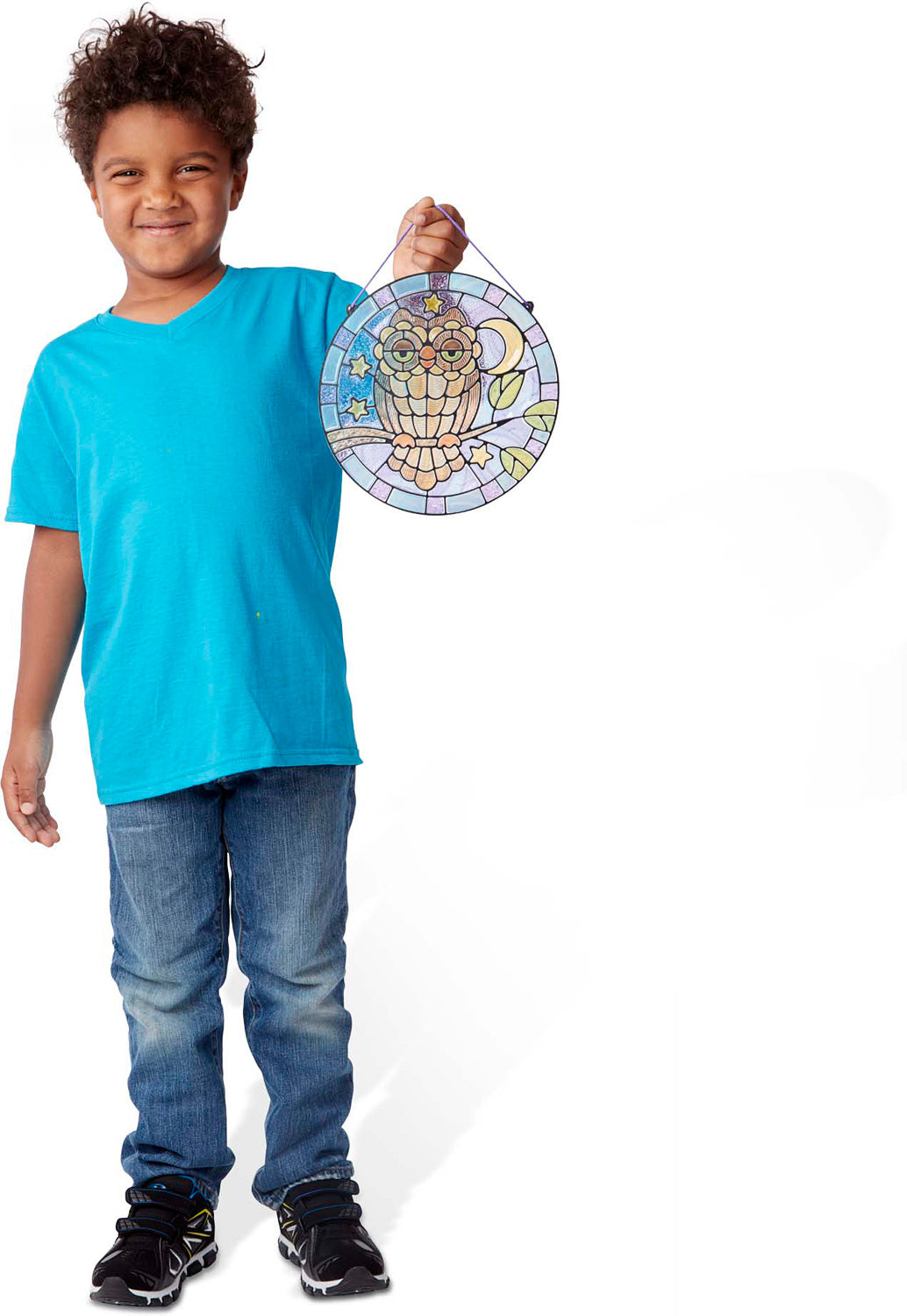 This peel-and-press sticker craft gives kids everything they need to easily create a spectacular piece of "stained glass" art. Just hold up the sheet of colored stickers to the clear frame, peel them off one at a time, and stick them on. Grooves and outlines on the frame make it easy to fit each sticker-featuring realistic textures like bubbles or swirls-into just the right spot. Use the included cord and suction cup to hang the finished artwork in a sunny window to see the charming owl shimmer to life. Young artists will be enchanted by the results and proud to show them off!