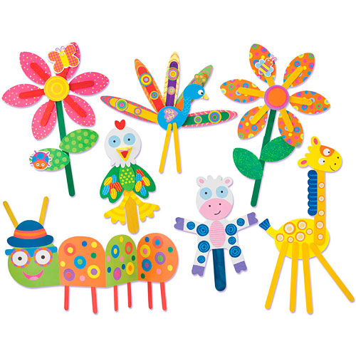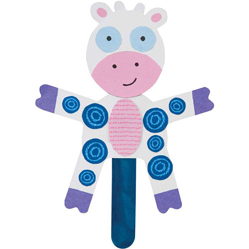 Create 7 playful pop stick projects! Make a giraffe, caterpillar, peacock, flowers, chicken and cow puppets.