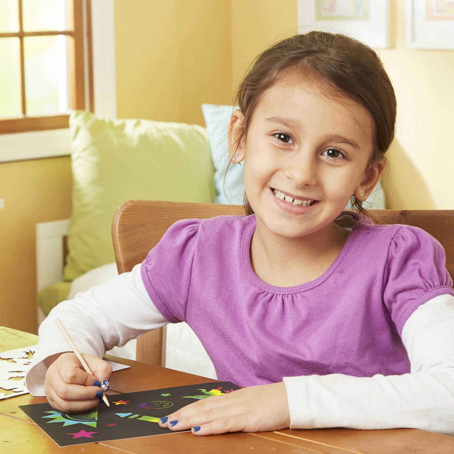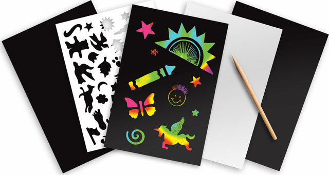 Use the wooden stylus to draw and trace on the smooth black surface-and see a rainbow of colors bring your design to life! This activity set includes four black-coated multi-color boards, a stencil sheet with 30 cutouts and a wooden stylus. Smrb