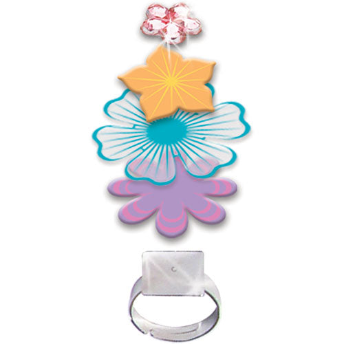 Make a dozen dimensional rings, perfect to wear and share. Also great party activity! Layer 90+ printed acetate and chipboard flourishes with rhinestones and glitter gel accents onto 12 metal ring bases. Includes a sweet 7"diameter foam flower ring holder.