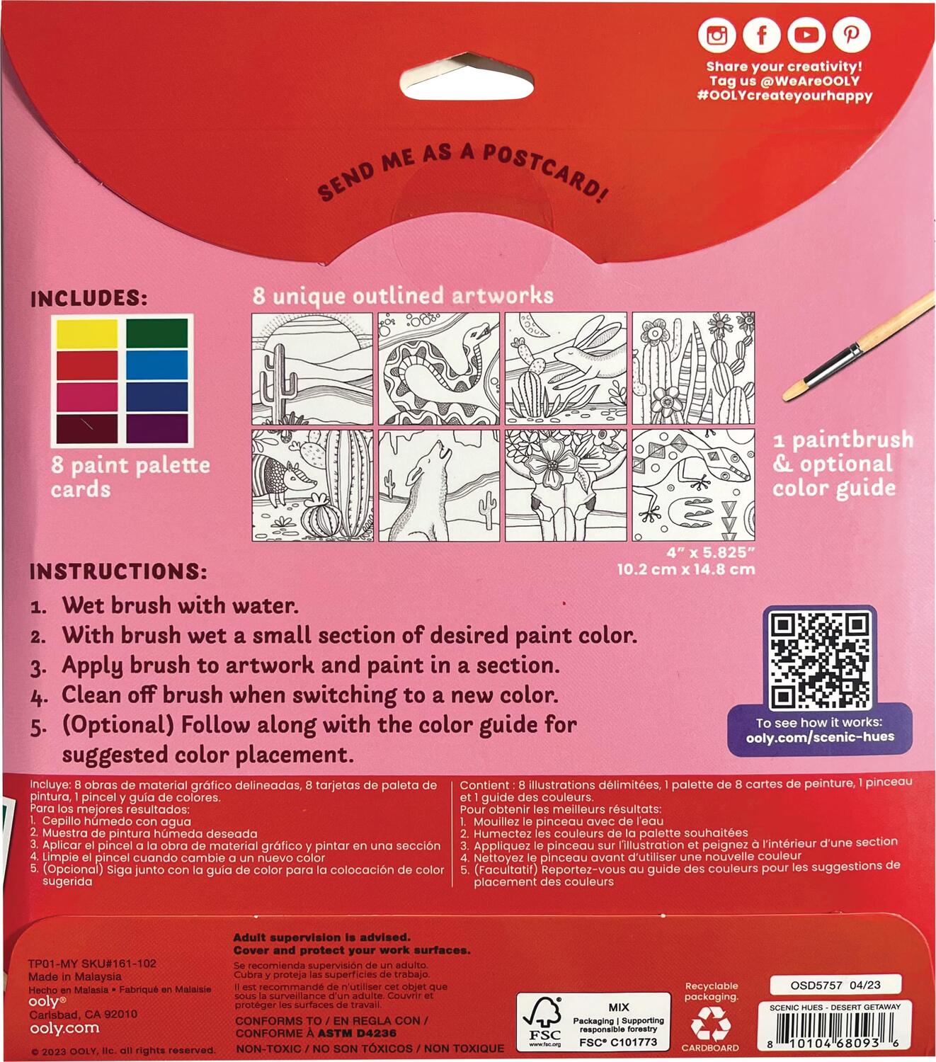 - Kit includes 8 different watercolor postcards, 8 paint palettes, 1 paint brush, and a color guide