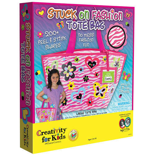 So simple, so fun, so fashionable! Transform this trendy tote with layers of peel and press fabric stickers. Includes a matching wallet and ID tag ready to personalize. The perfect purse, shopping bag, lunch bag, school tote or gift bag. Tote measures 16"w x 9"h with a 10" handle