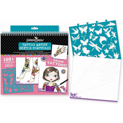 becoming a tattoo artist is easy with this fun portfolio! Design your own creations or start off with a stencil for some inspiration. The possibilities are endless! Includes 40 tattoo artist design sketch pages, 7 plastic stencil sheets (100+ stencils) and instructions to get your ideas flowing!