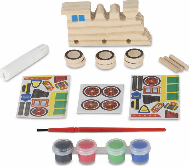 All aboard! Little engineers will love making their very own train with this craft kit.! Includes complete supplies to design and personalize a sturdy wooden train toy, including 6 wheels, 3 axles, 32 stickers, 4 pots of paint, a paintbrush, and glue-no tools needed!
