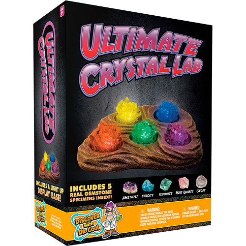 With this ultimate hands-on crystal lab you'll grow crystals in 8 different colors. Included are special silicon growing chambers so you can easily grow and remove your finished crystals. Once they've grown, display your best crystals on the light-up display stand which makes a beautiful night light! Includes learning guide and 5 real gemstones. For ages 8 yrs-teen, from Discover with Dr Cool.