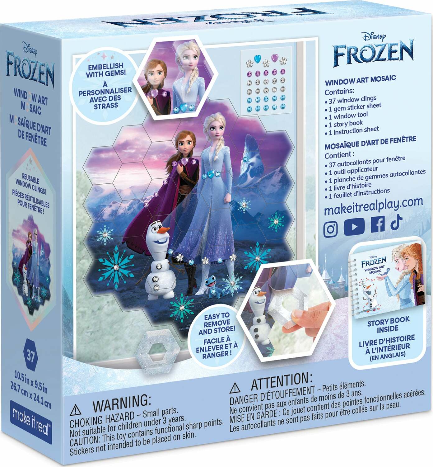 The fun of a puzzle and the result of a beautiful window decal! Start in the center of the puzzle, then challenge yourself to align the hexagons to create a fun Disney Frozen mosaic! Each kit contains: precut vinyl cling pieces on printed paper backing, hexagon removal tool to make easy transitions when moving the location of a piece or pieces, a story book with pages to store the window clings, and simple instructions.