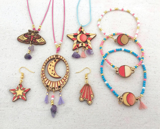 Paint laser-etched wood charms and assemble them into beautiful necklaces, earrings and bracelets! Stunning elements like amethyst beads, tiny tassels, and metallic gold fasteners give your jewelry a professional polish. Includes 10 laser-etched wood charms, 5 amethyst beads, 4 tassels, paints paintbrush, 3 sets of metal jewelry clasps, 4 earring hooks, 4 colors of plastic beads, pink cord, stretchy cord and instructions.