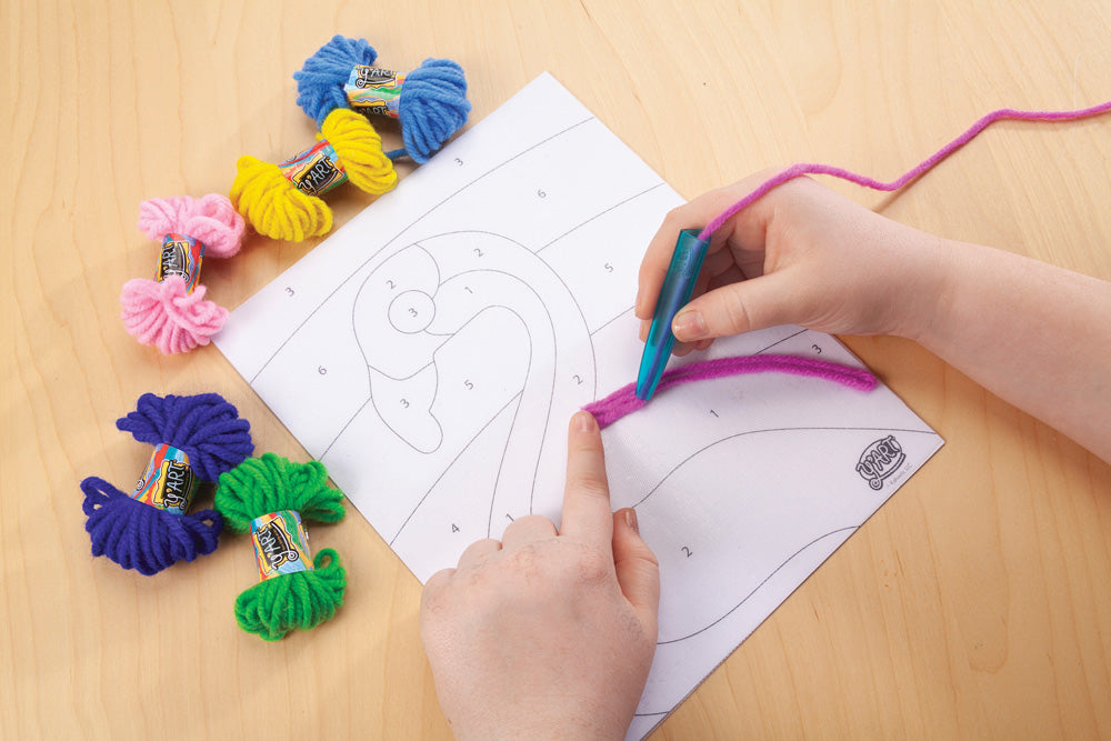 Color with yarn! Just thread the pen and press the yarn to the pre-printed design on the Grip-N-Stick Y'Artboard™. Presto! It clings like magic. There's even a frame to cut out, elevating the finished piece to keepsake status.