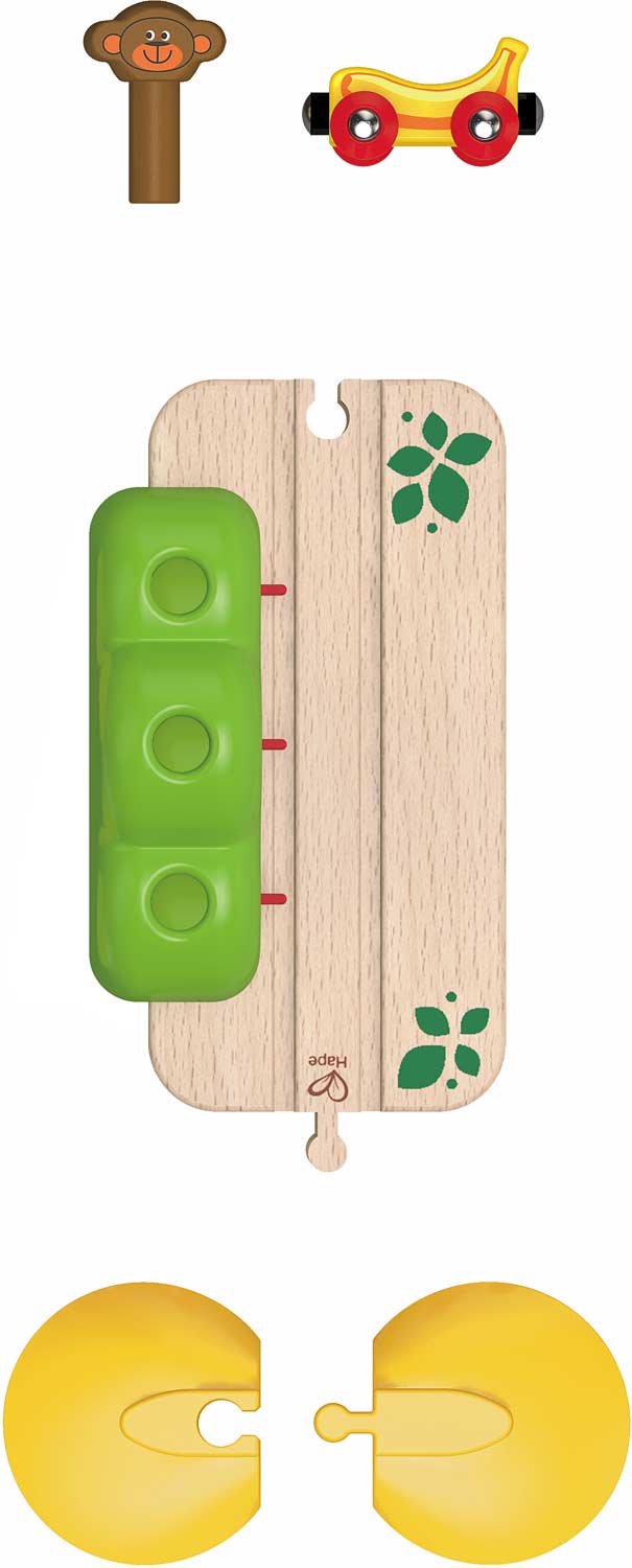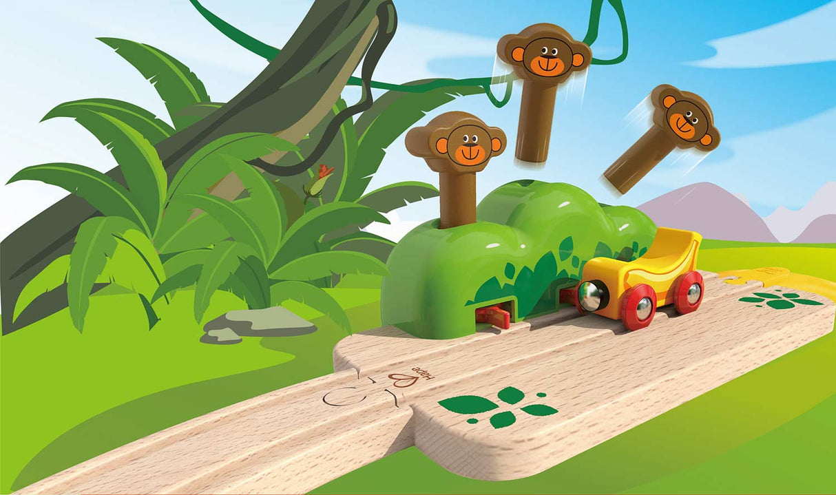carriage past this bush! Inside are three monkeys just waiting to pop up and steal it. The monkeys are activated individually when a carriage pushes their levers. Includes ramps for independent play, or connect to an existing wooden rail set for even more play options. For ages 18 months and over.