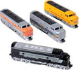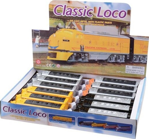12 per box All aboard the pacific express model diecast train Pull back action Made of metal and plastic Item 7" L. x 2" W. x 2" T No package Display with assorted colors Age 3+