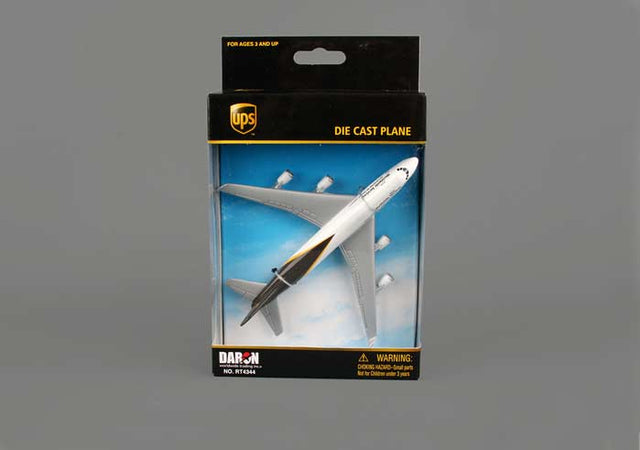This authentic die cast Boeing 747 plane contains four engines and sports the UPS logo on its tail. It is made of die cast metal.
