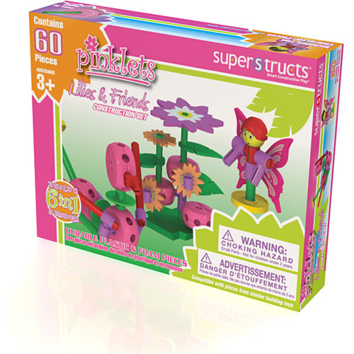 The pinklets Lilies Friends theme includes 60 plastic rods, connectors, wheels and decorative EVA foam flowers, leaves and wings. Lilies Friends is the perfect starter set for young girls and includes 32 page guide with step-by-step plans to create three friends, two environments and one fairy for endless role playing and story telling fun. Pinklets - lilies Friends can be used in conjunction with other Superstructs pieces and sets and allows for never ending play possibilities. Superstructs pinklets - Lilies Friends comes in a heavy duty box with a handle that is perfect for transporting and storing all the pieces! "easy" Difficulty Rating