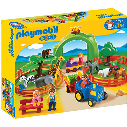 Go a little wild with the Playmobil 123 Large Zoo. Build storytelling skills and love for animals with a giraffe, elephant, zebra and more! Each piece is colorfast, easy to clean and safe for little zookeepers. Includes 9 animals, 5 family members, 2 enclosures, truck, trailer, carts and everything for your own zany zoo. For ages 1 1/2-4 yrs.