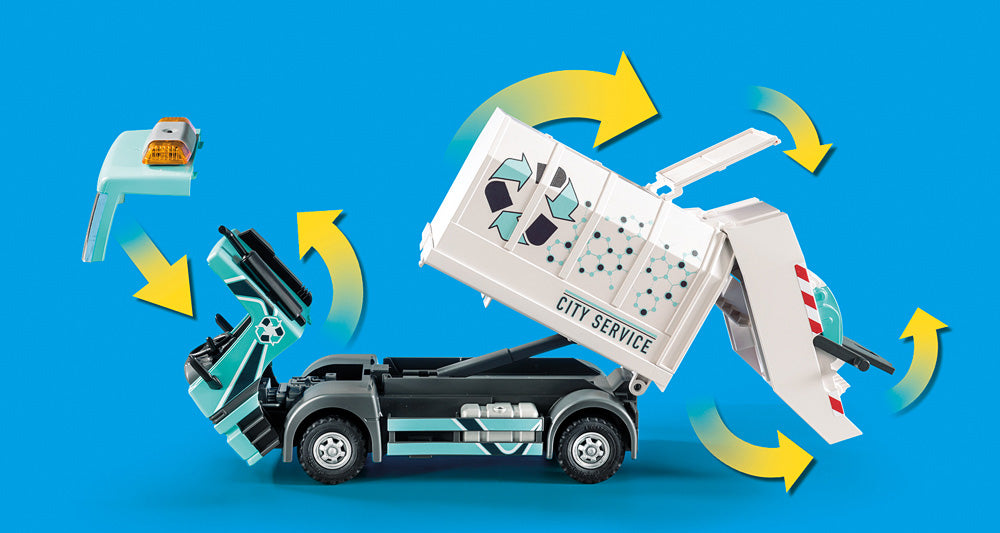 Going green is great fun! Help tackle the city's recycling efforts with these two workers and their flashing-light truck. Your Playmobil friends are ready to complete their route, working together to load various-sized recycling bins with wheels into the rear of the truck, then pulling the lever to empty them. Once it's all collected, they can head back to headquarters to empty their load by lifting the removable cargo portion of the truck. All in a day's work. Batteries included.